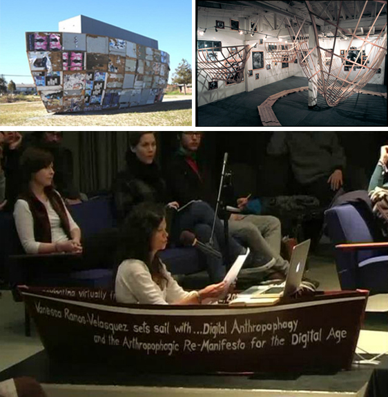 In the Anthropophagic Re-Manifesto for the Digital Age Vanessa Ramos-Velasquez recites her texts and engages the audience in the practice of “consumption (ingestion, digestion and excretion) involving a technological mediation,” where participants are invited to tear off and eat portions of texts written in black permanent marker on rice paper – a symbolic Eucharist. She seeks to update the anthropophagic practice of cultural cannibalism – mostly online or virtually – where anyone can be a colonizer. This ritual, recast in a positive light, no longer exists just to protect the physical body – the acculturation results from interaction and immersion in the work.