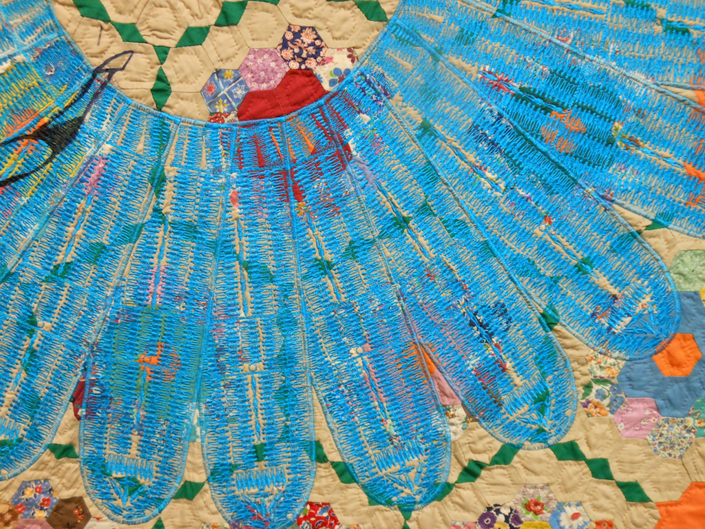 Sacred geometry (geometric design) and raw cotton “clouds” figure into his work, as seen in another quilt I saw him working on this week. Here, you can see Julie Mehretu‘s influence, as well as other motifs seen in Codex such as Lotus, Biggers’ “highly stylized,” twenty-four-petal filigree pattern in the shape of a flower.
