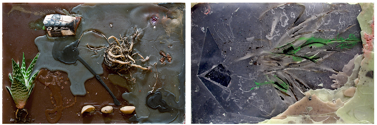 HN: At its “roots” the work is about ecological cycles: Life, decay, death, passing and preservation — even archiving is included within that. Time is a significant factor and is recorded and observed in the works in various ways. Sometimes the same plant reoccurs in different photographs at varying phases, sometimes the plants die and their detritus is reused as a material, and sometimes the plant sprouts new growth (that can then be pruned and reused). When the plant is “pressed” against glass or embedded in wax, it resonates with scientific notions of preservation and fossilization.