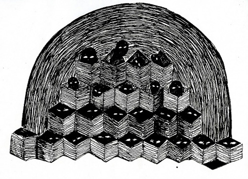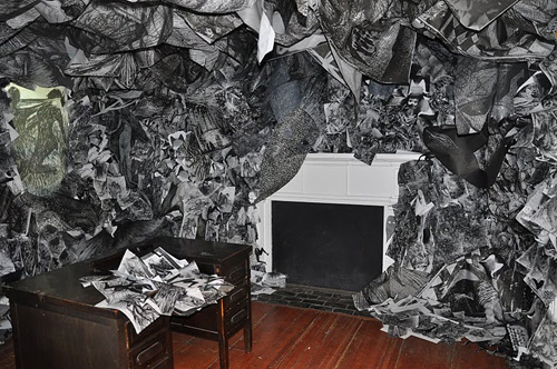 Sam Vernon. “how ghosts sleep (haunted house),” 2009. Pen and ink, xeroxed drawings, dimensions vary. At Smithy‐Pioneer Gallery, Cooperstown, NY.
