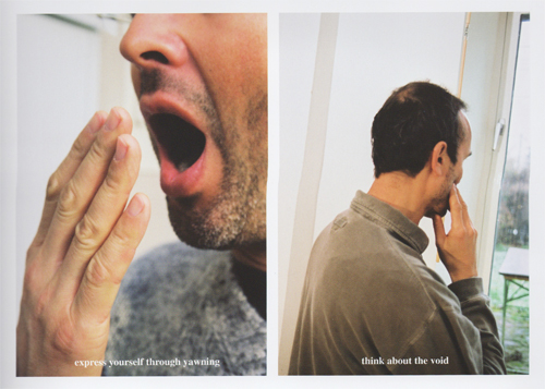 So, how do we as artists escape ourselves to have this For the Roses moment? This brings me to Erwin Wurm’s image with the subtitle Think About the Void (in his series Instructions for Idleness). When compared to the other sentiments in his series, like Stay in Your Pajamas All Day or Express Yourself Through Yawning, we are able to arrive at a sort of tongue-in-cheek existentialism. Yet taken on its own, Think About The Void doesn’t seem so far from the truth–picture hoards of MFA students desperately trying to find peace by staring out the window for hours on end. Artists are constantly trying to distract themselves in order for their brains to arrive at their next idea, or a solution to a problem in the studio. Artists drive, take showers, swim, or have sex as a way to occupy the body with one task, while allowing the mind some freedom to roam.