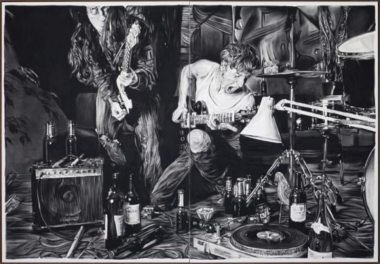 Rinus van de Velde. “Me and Conrad M. during one of our silent rehearsals with Xx Xxxxxx…” Charcoal on Canvas. Courtesy the artist.