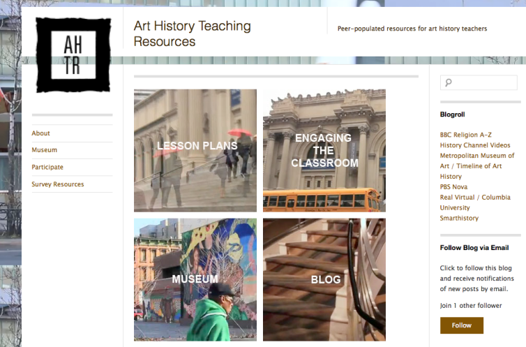 Cut to two years later, and I have almost finished building phase one of a website for sharing teaching resources. At SECAC, I co-chaired a panel titled The Museum and the Art History Survey Requirement with my colleague at Baruch College, Professor Karen Shelby, who has pioneered an awesome museum video project that the AHResources site will host. I shared my motivations for building the AHResources platform for art history survey teachers and my hopes for its final incarnation, and I got a lot of great feedback, critiques, suggestions, and questions. Last time I posted about this project on Art 21, I also got lots of great feedback for which I was truly grateful. One commenter suggested that this type of centralized resource was obsolete as there are so many resources already available online. While I agree that there are a range of materials already out there – from British Museum Director Neil MacGregor’s A History of the World in 100 Objects, to the truly awesome Smarthistory, and the Met Timeline of Art History, for a start – the culling of these resources into a thoughtful thematic lesson plan is what takes time, and what I want to short cut for time-short teachers. If we have access to a basic set of materials when we start out, we have more time to think about alternative teaching strategies. The lesson plans I have gathered so far gesture to many existing resources, including suggested short readings for students, at-home and in-class videos, and class activity templates. Other readers were more receptive to the idea of giving teachers basic tools. As one commenter pointed out, “so many of those who teach survey courses have no experience or training in teaching methods, a baffling irony of American higher education.” Another discussant rightly chided me for not doing more to support an interactive, participatory design process at this early stage, reminding me that any such platform should always work in “perpetual beta”–and so, more on this in a minute.
