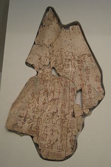 Ox scapula with a divination inscription from the Shang Dynasty, dating to the reign of King Wu Ding. (Wikipedia).