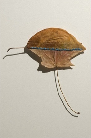 Chicago artist Judith Brotman engages leaves in her series “Natural Selections.” She very delicately cuts up, splices together or highlights their unique form using stitch work. On the one hand, these interventions call attention to the delicate fragility of leaves as a medium, on the other, the grain pattern of each leaf becomes a text in its own right. Inscriptions like these activate a surface—whether the original text be a book, a house, or a piece of bone—drawing something latent inside the text out into the open of a reader’s mind.