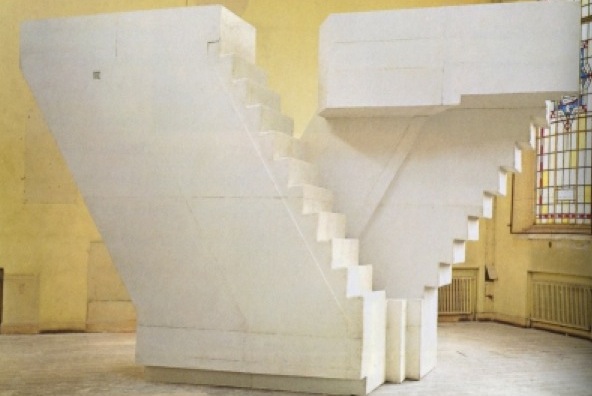 Gordon Matta Clark trespassed houses through aesthetic dissection. His resulting Frankensteins are breathtaking. He carves massive holes into floors and roofs and then photographs the result from different angles. In doing so he presents a Cubist conception of space: multiple perspectives of the same object can be viewed at once. He effectively unlocks the spatial attributes of a given (albeit abandoned) residence, using light and shadow to produce a new, flat representation of the original whole. In doing so he destroys the building’s original function. Through these interventions, he imposes himself on the house—the house becomes a text that Clark effectively “cuts up,” then reconfigures. In “Bingo,” a single, sculptural wall is practically useless. Somehow both part and whole. Signifier and sign. It is a map, a drawing, a cross-section, a monument; and the presence of its stairs is palpable.