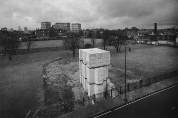 Or in this instance, we see the cast of one house’s interiority. It is alone on a block standing like a memorial for whatever houses existed there before. It refuses entrance. Whiteread does the same with books. The memory of these peculiar books and the shelves they sat on remains, while the texts they bore are impossible to access.