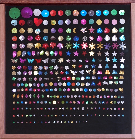 Ellen Nielsen, “Spectacle Box”, 2007. Sequins, pins, wood, glass, velvet, 9″ x 18″ x 3″. Courtesy of the artist.