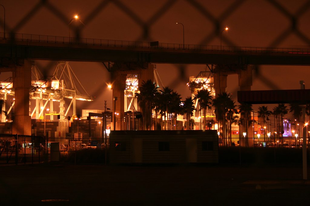 In 2005, Rasmussen was studying at Cal Arts, living in Los Angeles, and making frequent drives from Santa Ana to Valencia along the 110 and 405 freeways to photograph intensely personal work. She was becoming exhausted. “I had to cut this off. I needed to figure out something else to do. I didn’t go looking for anything but I was between LA and where I would go in Orange County—I would drive the 110 to the 405—and you kind of see the Port of Los Angeles when you’re going north… This one night, I was just like, “What is that? I have all my camera gear on me, I’m going over there.” In her 2005 artist book “fifth visit three daytime two nighttime first time alone, night time,” Rasmussen printed these photos in postcard size, making a brief travelogue about her experience—the thrill of trespassing alone at night on Terminal Island, fearing rape, death by heavy machinery or police arrest—and drawing parallels between the threat of violence to her own body and the aggressive reconstruction of land and water into manageable travel ways for massive commerce.