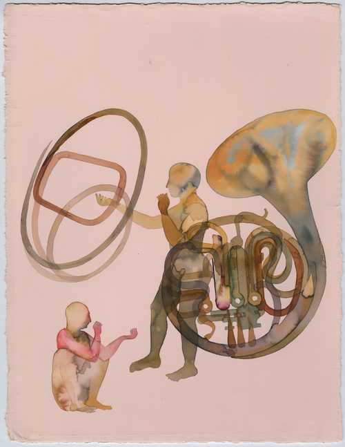 In her attempt to transform paintings into moving images, Sikander must determine which paintings are suitable. For her, this is an experimental process. “There’s a lot of testing going on in terms of how certain forms can create a sense of dimension, a sense of scale, a sense that they can expand indefinitely,” she explains. Of the paintings that make the cut for her animations, she might only use a fraction of the original image. A detail might be magnified and given new associations. For instance, the French horn in the painting at the very top here was extracted for The Last Post and the two figures were removed. Sikander brought the horn together with the top half of the image just above, which she enlarged and used as the background. The seamless end result floats through today’s Exclusive in a moment characterized by almost celestial depth and foreboding movement.