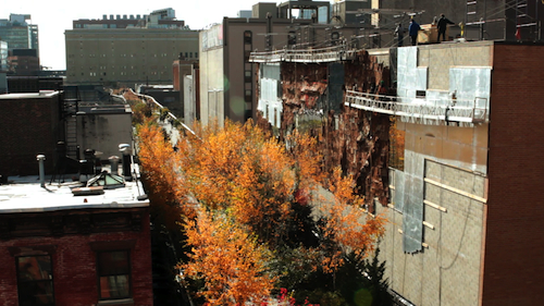 El Anatsui. “Broken Bridge II,” 2012. Installed above the High Line in New York City. Production still from the series Exclusive. © Art21, Inc. 2013. Cinematography by Ian Forster.