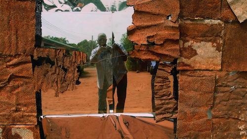 El Anatsui taking a photograph of himself in the reflection of “Broken Bridge II” (2012) at his studio in Nsukka, Nigeria. Production still from the series Exclusive. © Art21, Inc. 2013. Image courtesy El Anatsui.