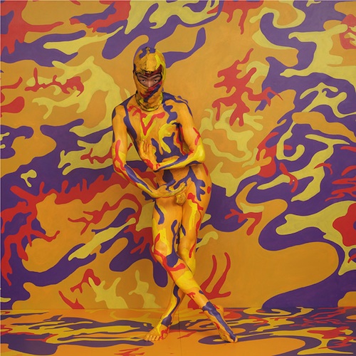 For another piece, Dance of the Cockatrice (2010), the artist painted his body a yellow, purple, red, and orange camouflage, and performed against a background and floor bearing the same pattern. Throughout the performance, he peeled away his “second skin” to reveal the first layer of his own, suggesting how individuals camouflage themselves in an effort to blend into new environments.