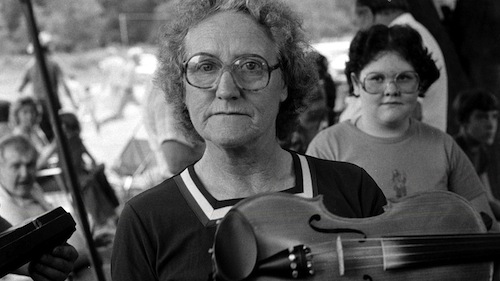 Matokie Slaughter with her fiddle. Production still from the series Exclusive. © Art21, Inc. 2013. Image courtesy the Alice Gerrard Collection at the Wilson Library, The University of North Carolina at Chapel Hill.