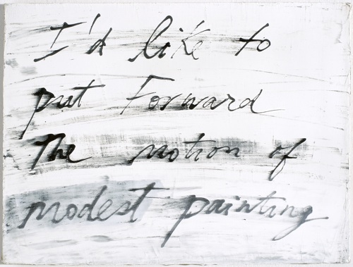 MS: I propose “modest painting” as a counterbalance to the pressure on artists to self-commodify in order to survive with the realm of the spectacle. There are lots of paintings that are aimed for the boardroom or the boardroom-sized living room of some hedge fund manager, that are meant to compete with and support other spectacular pursuits in the culture, but there are still paintings that do something else, that work with what painting can do. I’m careful to note that not all modest paintings are small and not all small paintings are modest.