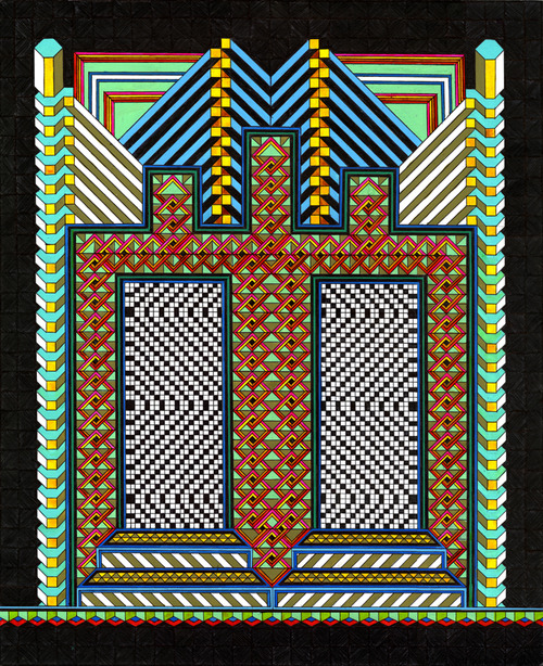 Edie Fake’s punk ethos of reciprocity and collaboration extends into his work as a comic, tattoo, and performance artist. His arresting graphic work plays with the fluidity and elasticity of images, which sometimes literally interconnect, as in the continuous sidewalk seen in the foreground of his Memory Palaces series. The looping movement in these drawings exhibits an almost cinematic pacing. Below, Fake gives us some background into how his experience working in film impacted him, as well as how his cross country travels in a big, veggie-oil-powered school bus led him, prodigal son style, back to Chicago.