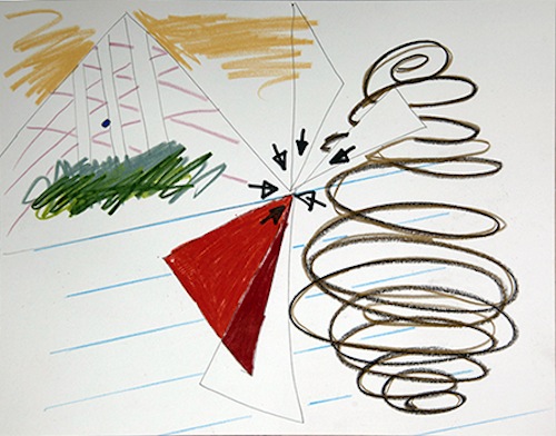 Jessica Stockholder. “Story of Angle #3,” 2013. Graphite and colored pencil on paper. 11 x 14 in. Courtesy the artist and Barbara Edwards Contemporary.