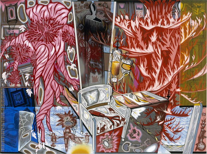 Lari Pittman, Untitled #11, 2003. Matte oil, aerosol lacquer, and Cel-Vinyl on gessoed canvas, 76 x 102 inches. Courtesy Regen Projects, Los Angeles, and Thomas Dane Gallery, London © Lari Pittman.
