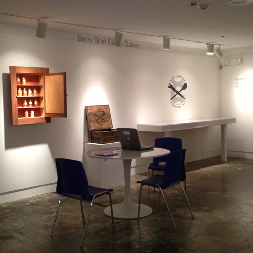 One afternoon I received a call from Grace who was seeking direction on how to display the items in the kit. We agreed to place many of them in vitrines, a decision that still bothers me. It occurred to me later that securing the items under plexiglass was at odds with one of Beatriz’s core objectives: public engagement. So I decided to include the Anti-Cancer database on a centrally-located laptop and a beta version of the Anti-Cancer game on an iPad. Grace, perhaps also sensing the tension between the vitrined display and Beatriz’s intentions, created a space where visitors could share their personal experiences with cancer by writing their stories on Post-it Notes and sticking them to a gallery wall. For me, there was an important lesson in these later decisions: there can be multiple ways to carry out an artist’s vision after he or she has passed.