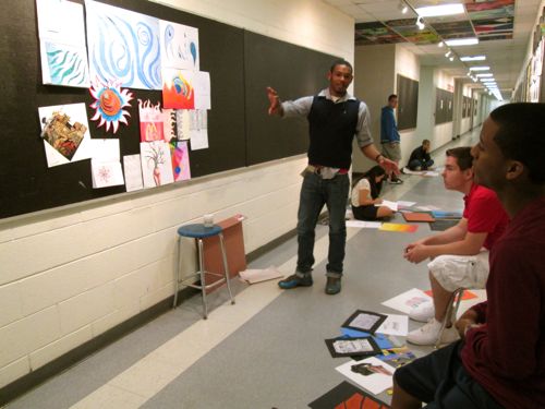 Some of the work that stood out included a layered collage after Darique (pictured above) discovered certain kinds of shapes continuously came up in his work and that he loved “drawing with a blade”. Another student decided to use her Mom’s Poloroid cameras in order to make a large work from many small pieces she shot herself. A third took the opportunity to create a fluid, delicate watercolor and then subsequently discovered the work of Polly Apfelbaum after we got to investigating her approach to the composition and working with particular shapes.
