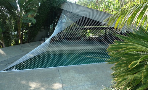 Two delicate pyramids Veilhan built out of thin wood triangles sat on another living room table. The installation Rays was outdoors and especially good to look at around sunset. According to Veilhan, it served as “a metaphor of the continuity between inside and outside proposed by modern architecture.” White polyester ropes angled down from the house’s roof to the edge of the pool, twisting just a bit, shimmering and sometimes altogether blending with the disappearing sunlight. At night, the rays cast shadows across the water.