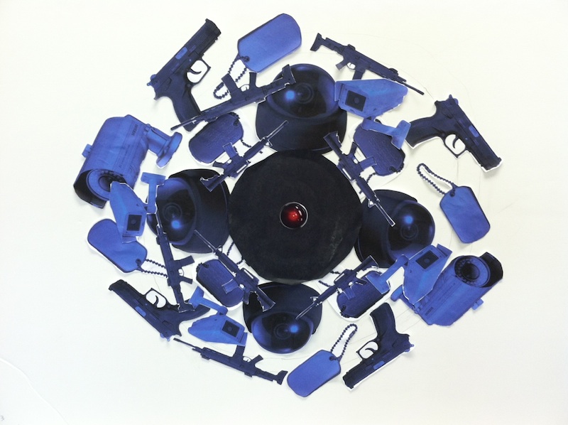 Made by students Nick Ward, Andy Braunschweig, and Grant Johnson, Surveillance, 2013. Foam poster board, color printer ink, paper, glue. Student work generated in an eighth grade English class as part of a unit on dystopia.