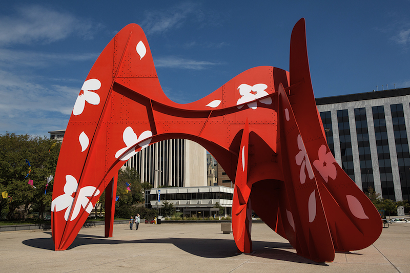 David Dodde, Fleurs et Riviere, 2013. La Grande Vitesse (Alexander Calder, 1969) as substrate; 43 x 54 x 30 feet; 1,500 magnets, 18 flowers, and 39 leaves, hand-cut. Photo: Brian Kelly