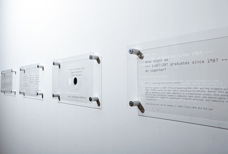 BFAMFAPhD is an open-ended project that endeavors to unite artists in order to address the problems of their rising population in this country. The application form to join the project (available on the project’s website) states that this ongoing research and organizing initiative “visualizes the number of students graduating with creative degrees, generates dialog about our collective power, and elicits proposals for organizing efforts.” If artists opted to put their money into cooperative loans rather than tuition, this capital could be pooled for the benefit of the community. Moreover, if schooling were free, as it is in many countries abroad, artists might be granted the financial liberty to focus on politically engaging and provocative work instead of feeling pressure to create sellable, sometimes conservative, work. The initiative, its website, and its related installation and talks at the Queens Museum of Art aim to raise awareness about these issues.