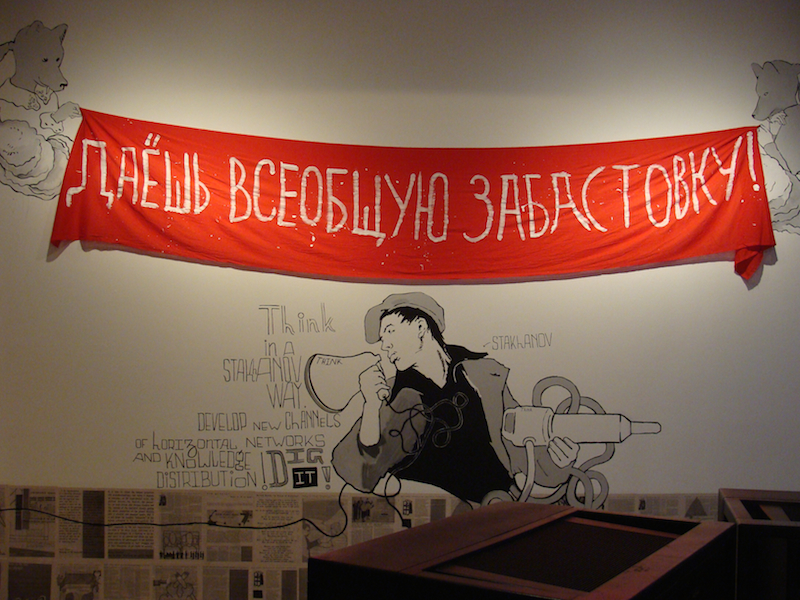 Chto Delat. Installation view of the exhibition What Is to Be Done?—The Urgent Need to Struggle at the Institute of Contemporary Art, London, 2010. The banner reads, in Russian, “We want a general strike!” Courtesy the artist.