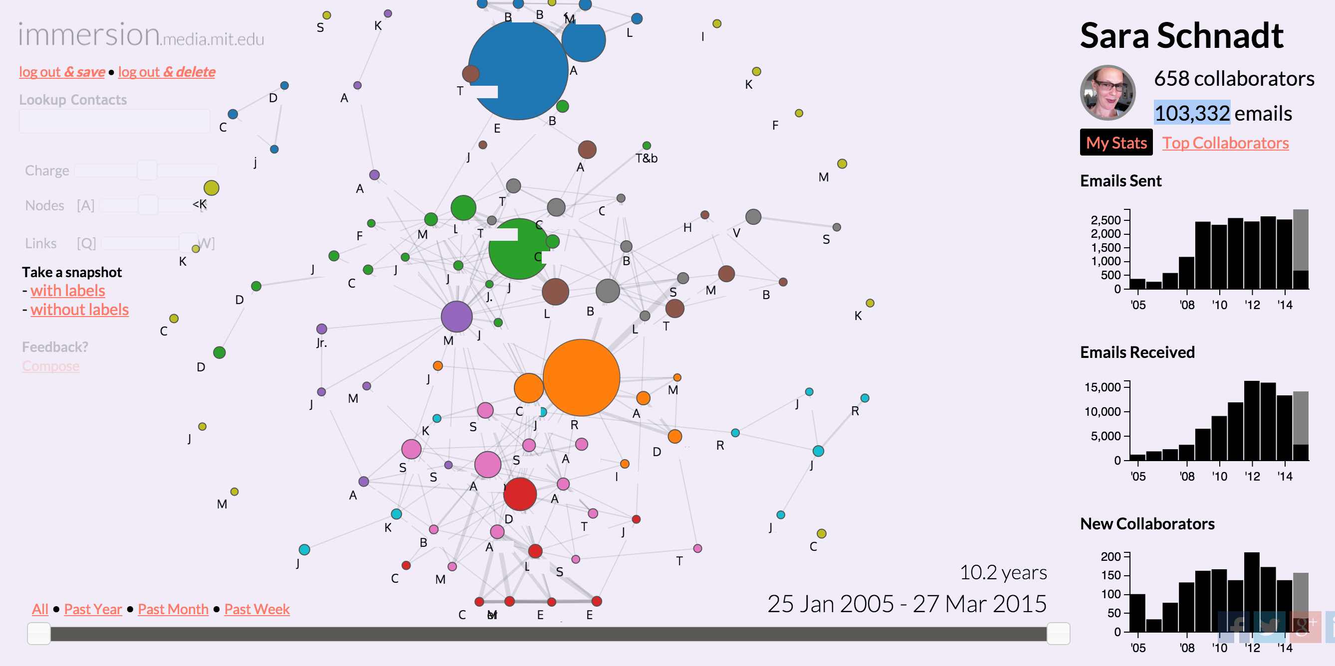 Sara Schnadt. My Email Community, 2015; anonymized visualization of 10 years of email interactions using MIT Media Lab’s Immersion Project. Courtesy of the artist.